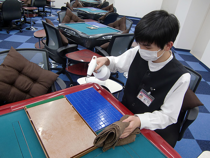 麻雀卓・麻雀牌・テーブル・椅子・ドアノブ、エレベーター内のボタン、化粧室の扉等、