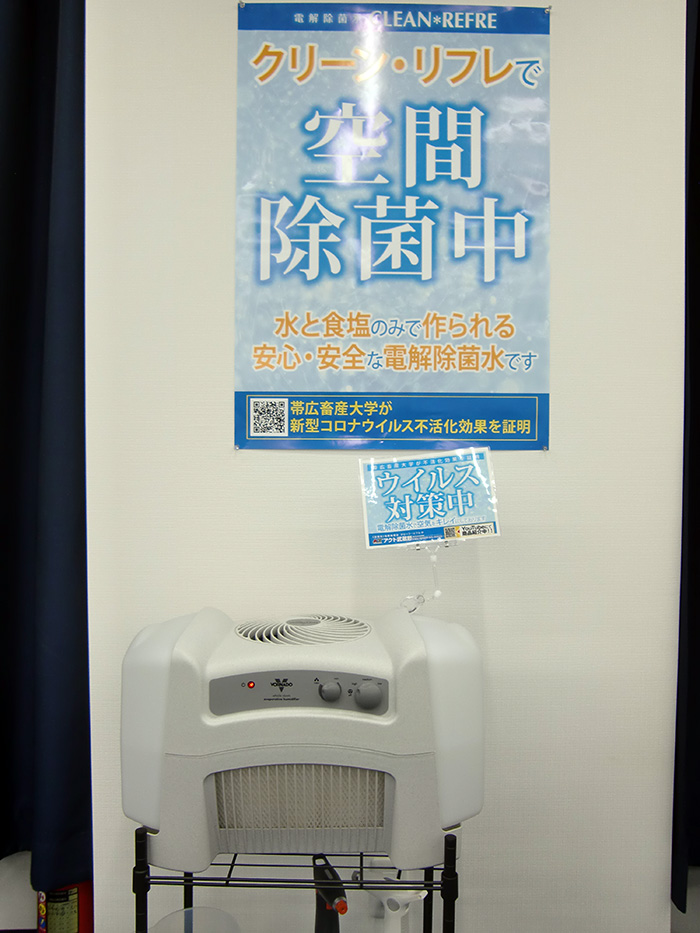 クリーンリフレ噴霧による空間除菌を実施しております。