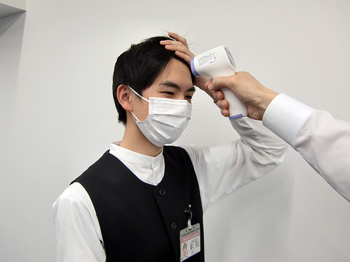 従業員通用口にサーモグラフィを設置し、体温の確認と手指の消毒を徹底しております。また37.5度以上の発熱や、体調が優れない従業員は、病状回復後2日間が経過するまで大事を取って自宅待機としております。